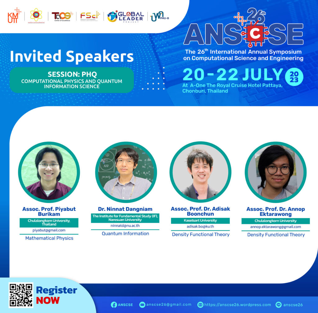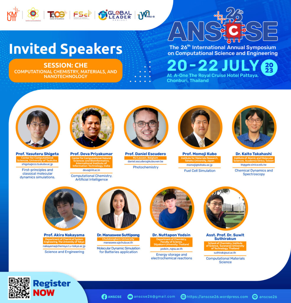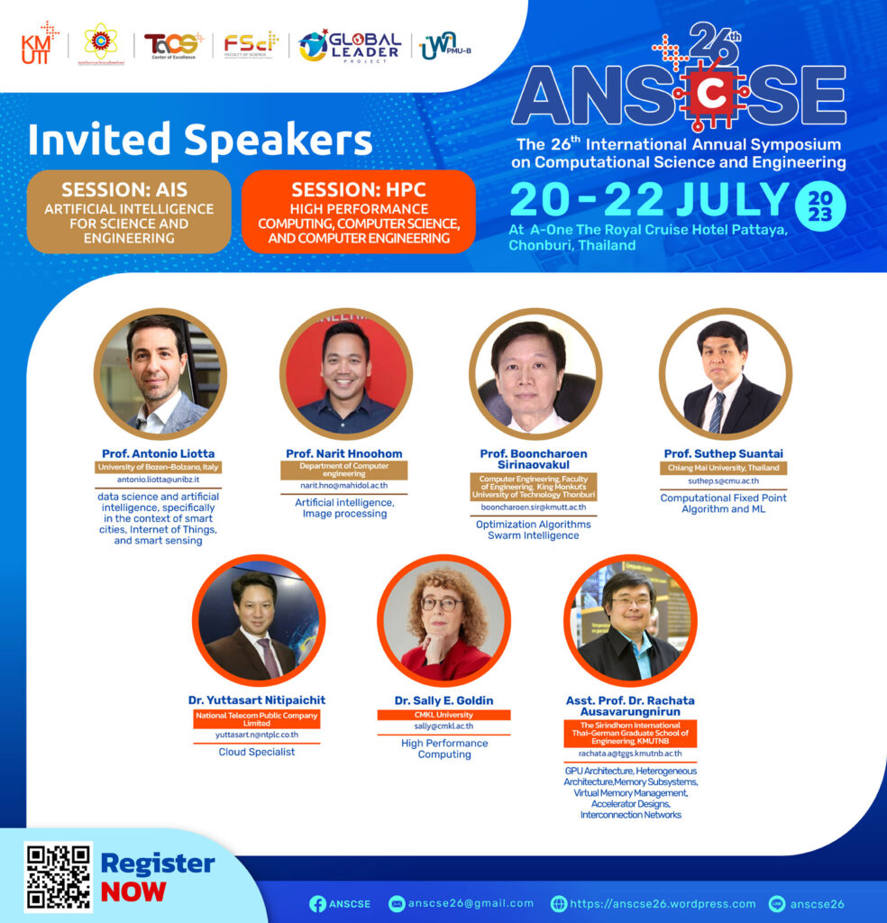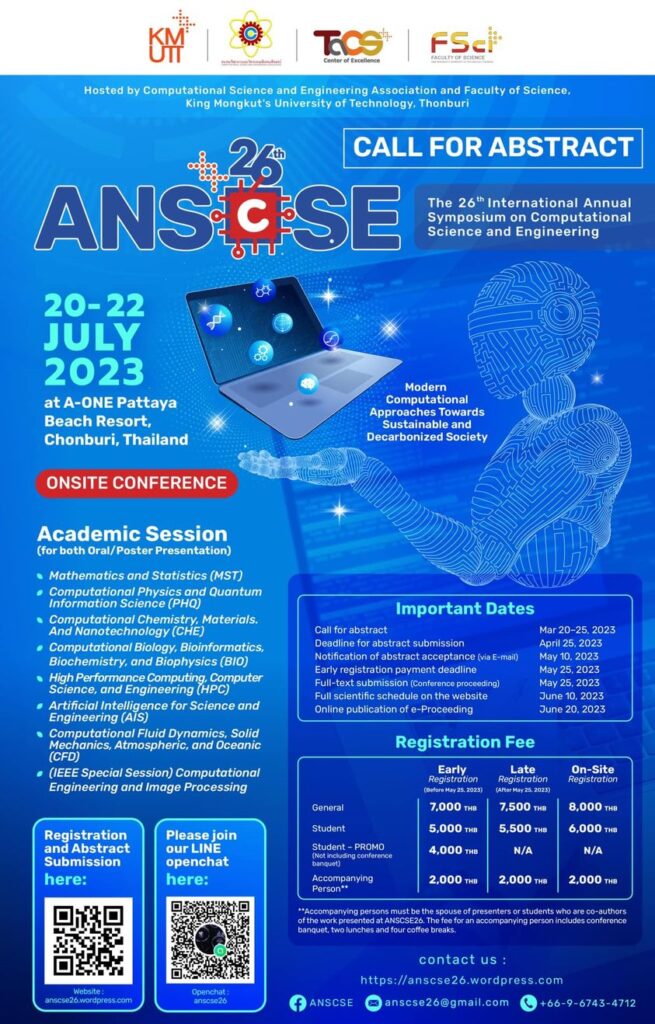 We are glad to invite you to attend the 26th International Annual Symposium on Computational Science and Engineering (ANSCSE26) hosted by Center of Excellence in Theoretical & Computational Science (TaCS-CoE), Faculty of Science, King Mongkut’s University of Technology Thonburi (KMUTT) in 2023. Further details will be announced soon.